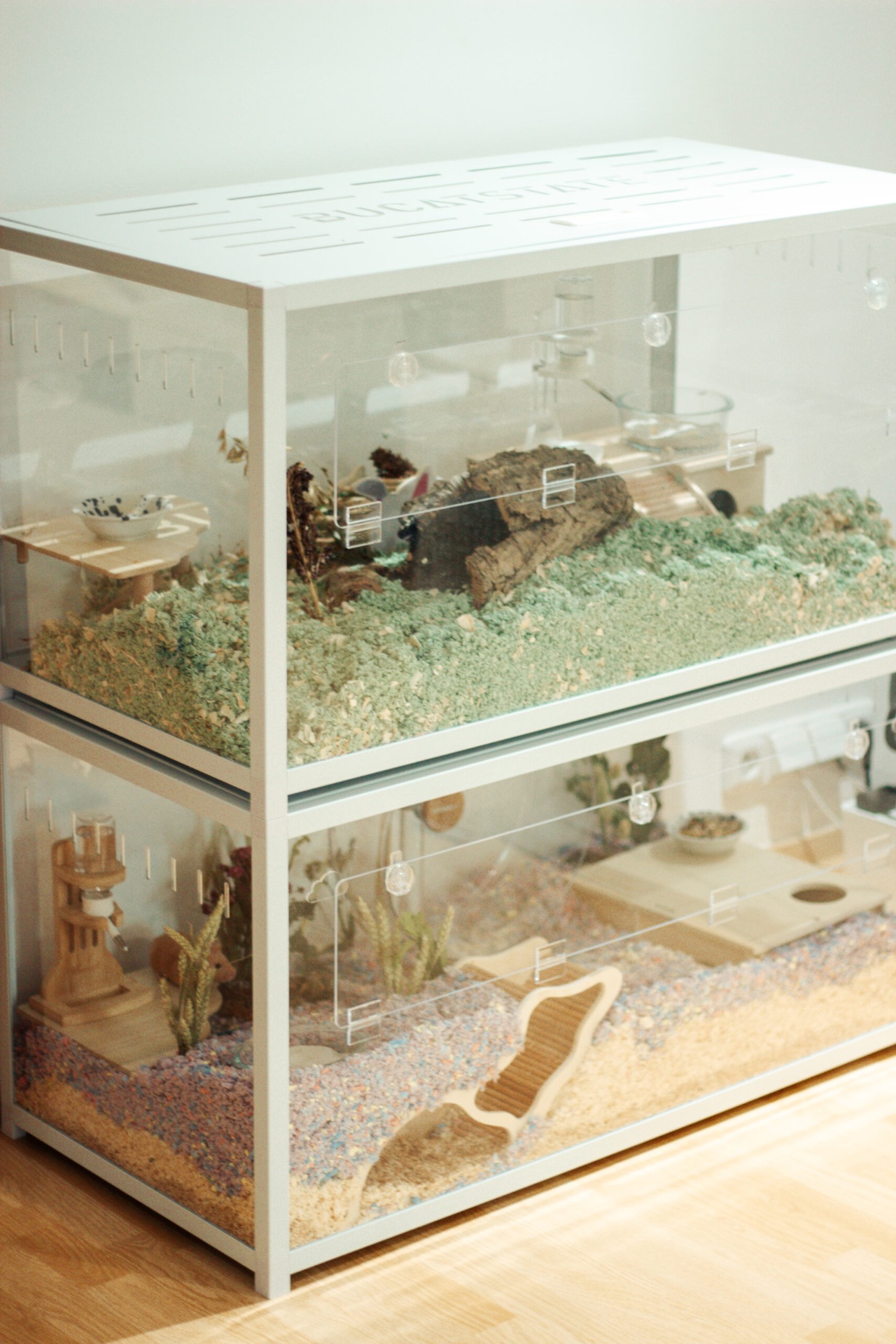 Ubikace by měla mít hlubší vanu pro silnou vrstvu podestýlky a dostatečnou výšku, aby se do ní vešel kolotoč o průměru 32 cm.